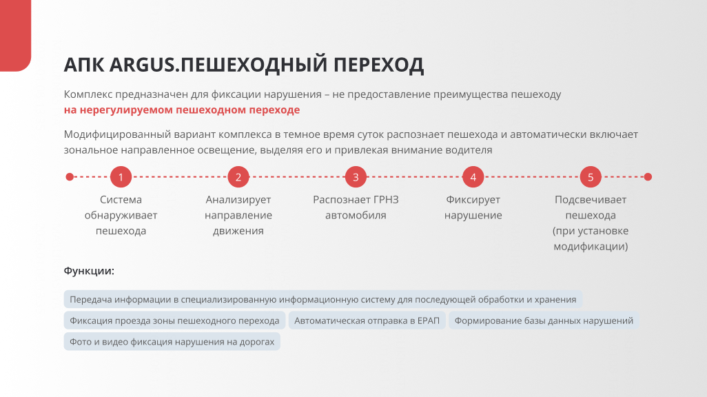 АПК Argus. Пешеходный переход предназначен для автоматического выявления нарушений правил проезда пешеходных переходов и повышения уровня безопасности дорожного движения. Комплекс фиксирует случаи непредоставления преимущества пешеходам и обеспечивает визуальное предупреждение водителей в режиме реального времени.